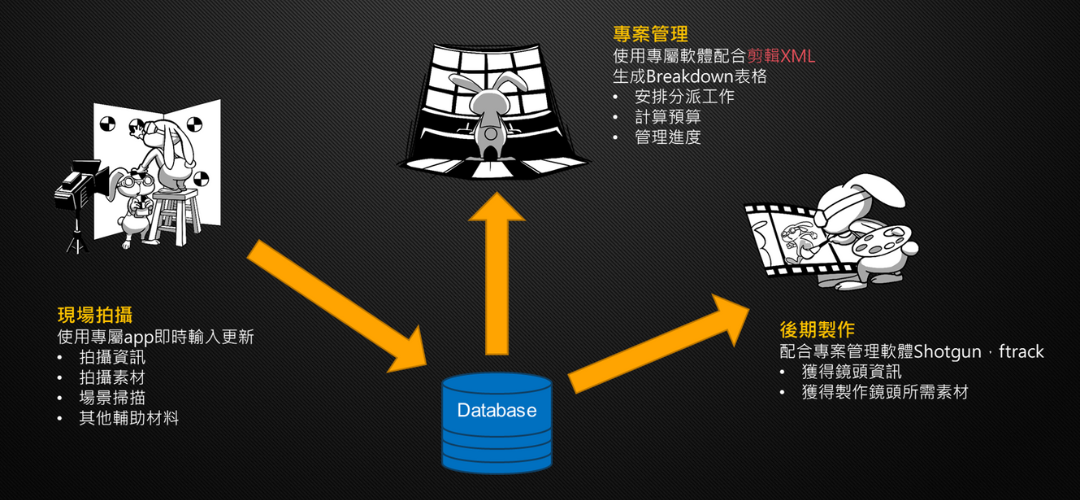 兔将开发的专属系统 TWR On-Set Studio 适用前期拍摄到后期制作的档案管理,现场拍摄时可将相关拍摄素材实时输入与整理,实时将数据同步在 Database ,让各方环节得以更方便获得拍摄镜头信息、掌握进度与控制预算。此独有系统帮助我们与客户提升工作效率,同时维持并呈现高质量的成果。